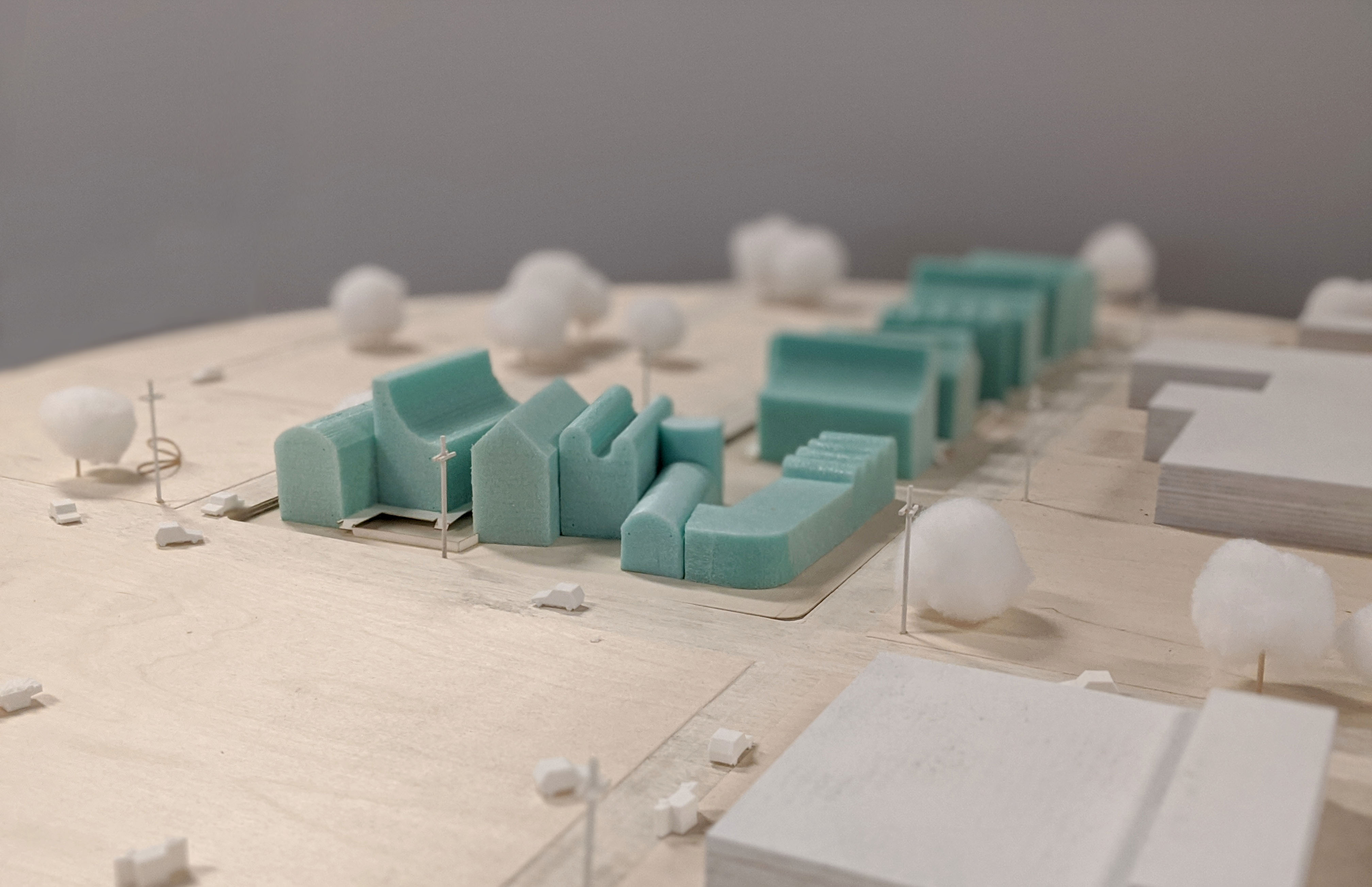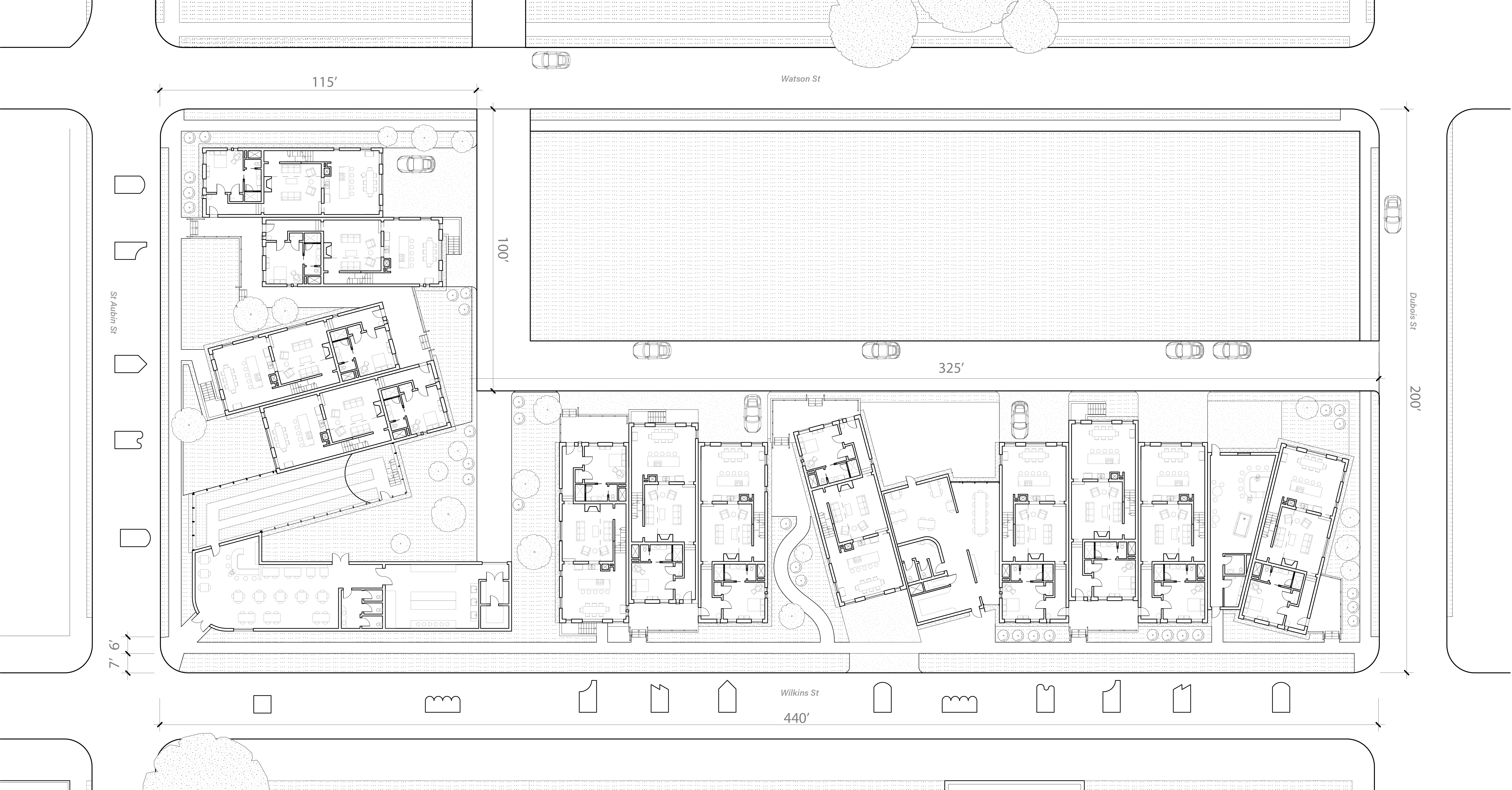 Gables, Bumps, and Lumps is a Detroit Housing project that is critical of the single-family home as well as the mid-rise apartment. Occupying a density between these two typologies the rowhouse allows for great attention to the craft of a single building while providing enough uniformity to be replicated across the site incrementally.